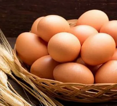 Several brown chickens are inside a poultry farm, positioned in a row along feeding troughs. They are pecking at the feed that is placed in a long blue trough, with wooden partitions separating each bird. The environment is structured with metal and wood, and the farm is under a roof with natural light visible at the far end.